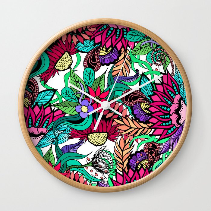 Girly Vibrant Flower Garden Illustrated Drawings Wall Clock